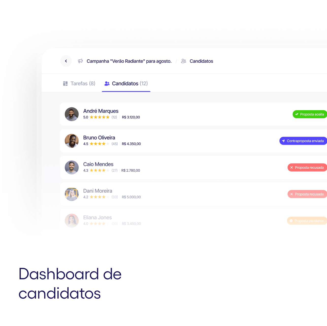 Da curadoria de perfis verificados à gestão financeira centralizada. Explore as funcionalidades desenhadas para dar agilidade, segurança e transparência total à sua operação.
